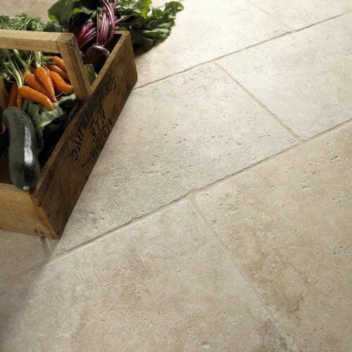 This tumbled light travertine with its worn and rounded edges is the most popular in the range.